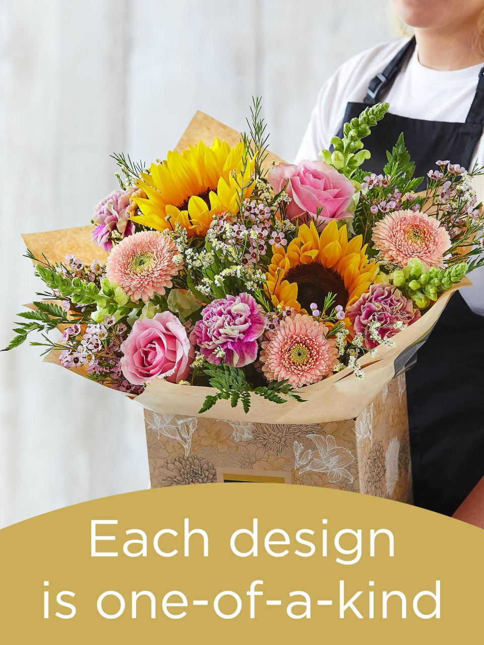 Each and every design is one-of-a-kind, created by an artisan florist using the freshest stems available on the day so, whilst your gift will look different to the one pictured, it’ll still be just as lovely.